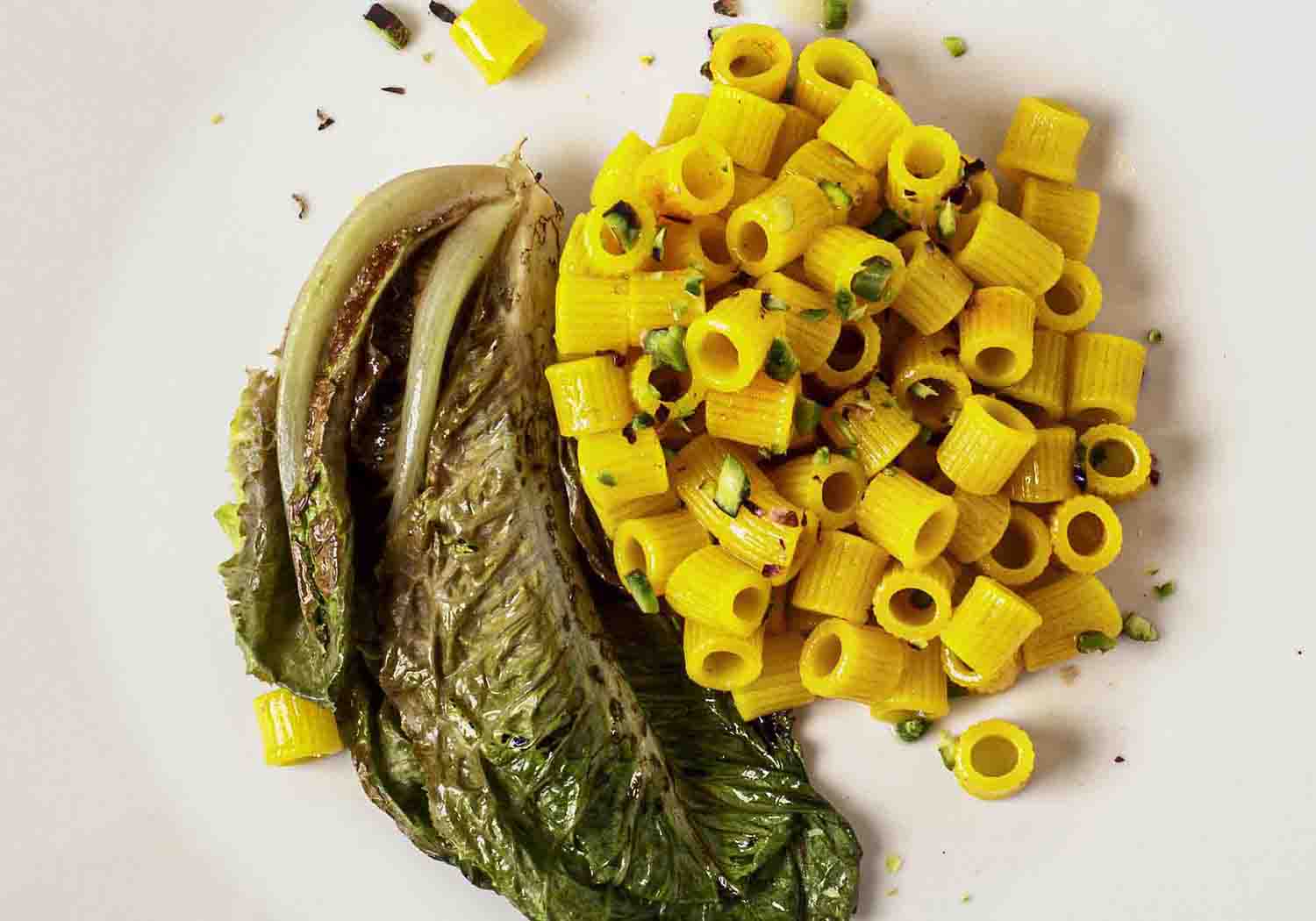1. Mentre fate cuocere in abbondante acqua salata i Ditali rigati La Casa del Grano, fate arrostire senza aggiunta di oli o grassi i cuori delle lattughine, aggiustate di sale e pepe e tenete da parte.