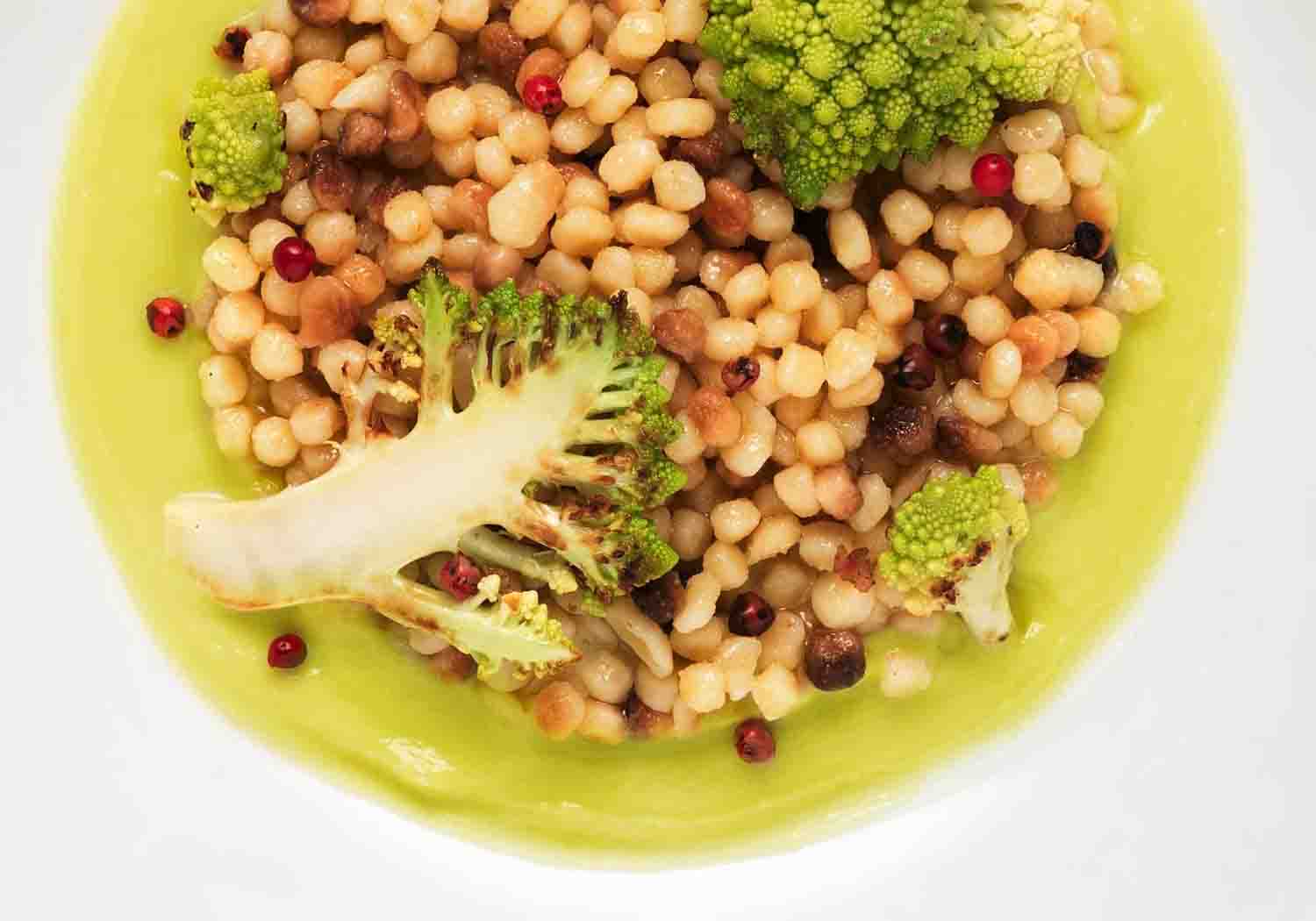 Fregola con crema di broccoli, colatura di alici e pepe rosa